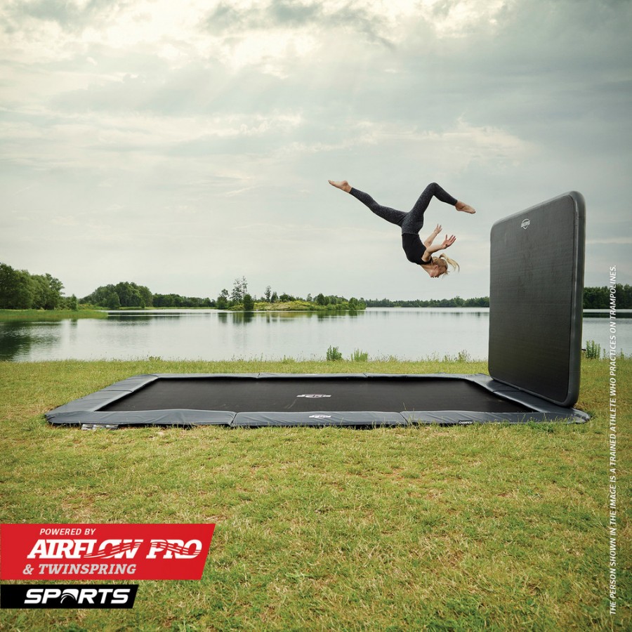 Das optionale Sicherheitsnetz (Höhe: 220 cm!) passt sowohl auf die Regular- als auch die FlatGround-Ausführung dieses Trampolins. Damit ist dies neben dem Ultim Champion FlatGround das einzige FlatGround-Trampolin, das mit einem Sicherheitsnetz kombiniert werden kann.
