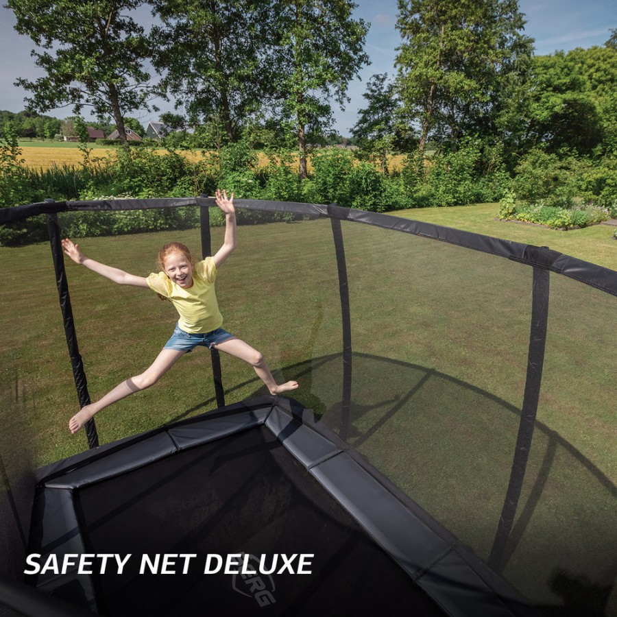 Das optionale Sicherheitsnetz (220 cm hoch!) passt sowohl auf die Regular- als auch die FlatGround-Ausführung dieses Trampolins. Damit ist dies neben dem Ultim Elite FlatGround das einzige FlatGround-Trampolin, das mit einem Sicherheitsnetz kombiniert werden kann.