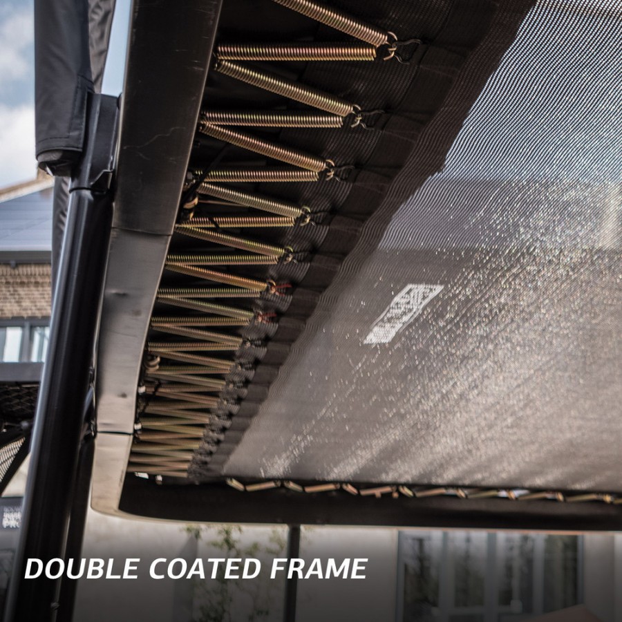 Das Ultim Champion ist natürlich mit AirFlow-Sprungtuch und TwinSpring-Federn ausgestattet. Das AirFlow-Sprungtuch lässt 50 % mehr Luft durch, wodurch du höher springen kannst und weniger schnell ermüdest. Dank der schrägen Anordnung der Twinspring-Federn können mehr und längere Federn verwendet werden. Dies gewährleistet ein größeres Springvergnügen und einen größeren perfekten Sprungbereich.