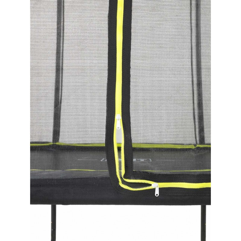 Das EXIT Silhouette Trampolin auf Füßen ist ein großes rundes Trampolin mit einem Schutzrand. Das Sicherheitsnetz, dass standardmäßig mit den Trampolinen auf Füßen mitgeliefert wird, ist mit gebogenen Pfosten ausgestattet damit das Netz straff gespannt steht. Das ist nicht allein extra sicher, weil Kinder nicht im Netz hängen bleiben können, sondern sieht es auch ruhiger im Garten aus. Das Sicherheitsnetz ist mit einem gut auffallenden, fluoreszierenden grünen Reißverschluss ausgestattet, sodass du direkt sehen kannst ob der Reißverschluss gut verschlossen ist.