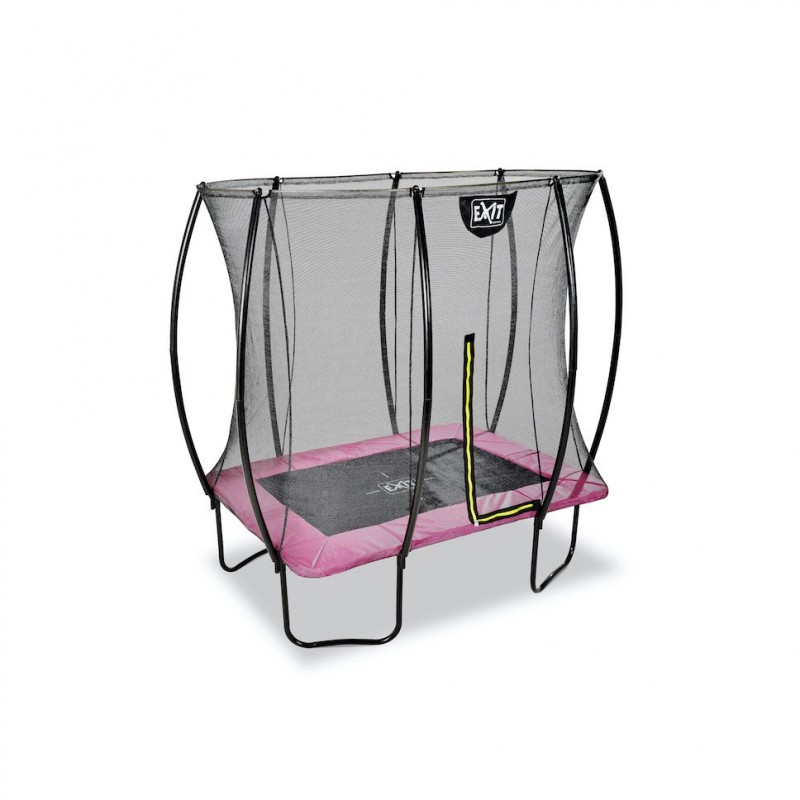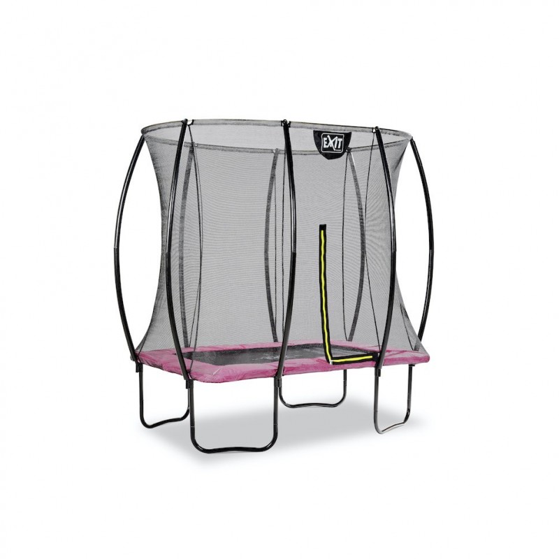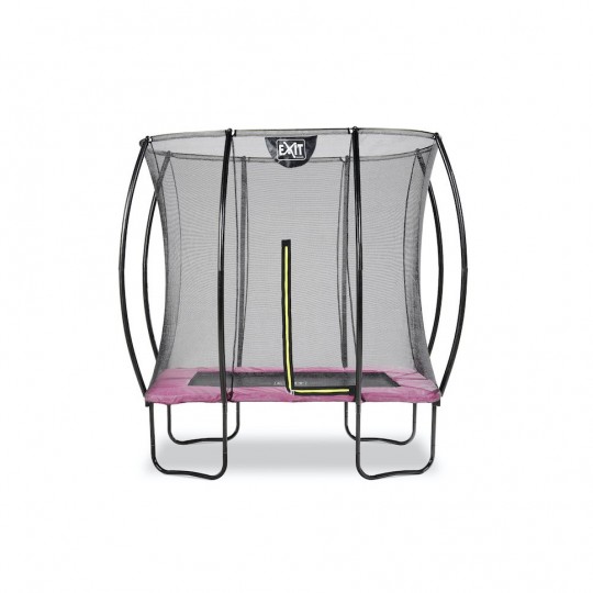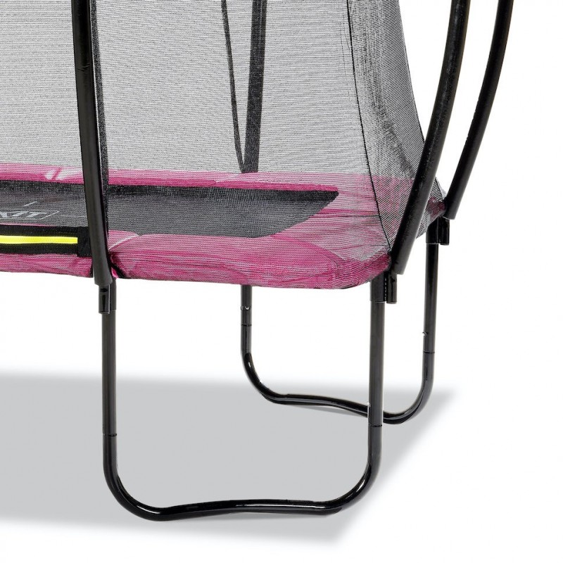 Das EXIT Silhouette Trampolin auf Füßen ist ein rechteckiges Trampolin mit einem rosa Schutzrand. Das Sicherheitsnetz, dass standardmäßig mit den Trampolinen auf Füßen mitgeliefert wird, ist mit gebogenen Pfosten ausgestattet damit das Netz straff gespannt steht. Das ist nicht allein extra sicher, weil Kinder nicht im Netz hängen bleiben können, sondern sieht es auch ruhiger im Garten aus. Das Sicherheitsnetz ist mit einem gut auffallenden, fluoreszierenden grünen Reißverschluss ausgestattet, sodass du direkt sehen kannst ob der Reißverschluss gut verschlossen ist.