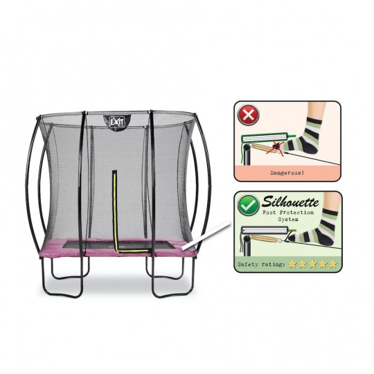 Der hochwertige Schutzrand deckt die galvanisierten Federn völlig ab und ist mit einem spezialentwickelten Fußschutzsystem ausgestattet, sodass dein Fuß nicht zwischen die Federn kommen kann. Die kräftigen Federn garantieren eine gute Sprungkraft. Der Rahmen des Silhouette Trampolins ist galvanisier und pulverbeschichtet damit Rost keine Chance hat. Die EXIT Silhouette Trampoline sind toll, solide und sorgen für endloses Springvergnügen!